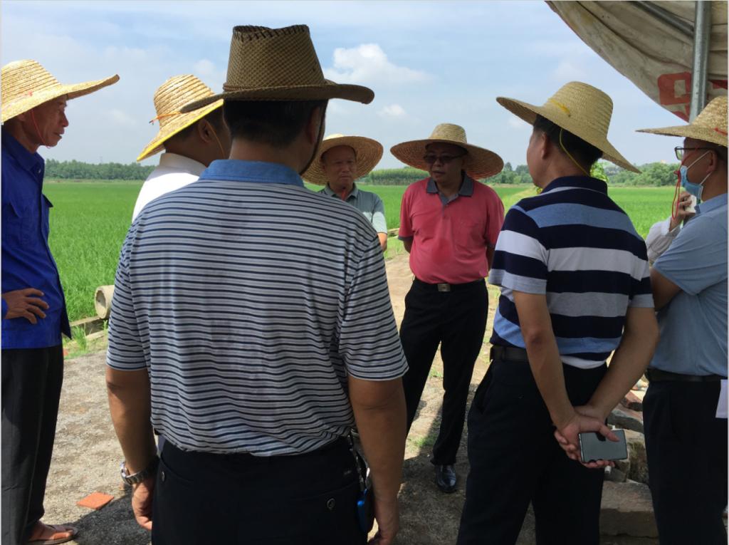 该海水稻基地位于遂溪县建新镇卜巢村的海河潮汐区,于2019年申报省级乡村振兴战略专项——现代种业提升项目《海水稻种质资源原生境保护圃建设》,并获得批准立项。海水稻原生境保护区设置有:种质资源保护种植区、鉴评筛选种植区,以及杂交利用品种培育杂种圃、选种圃、鉴定圃、品种比较试验圃及品种展示区等,并配置有海河水盐度调控蓄水池。2020年晚季种植的海水稻种质资源有365份。在海水稻基地,调研组仔细查看了海水稻原生境保护区和365份海水稻种质资源的生长情况。领导专家们一边认真听取周鸿凯教授就海水稻种质资源、品种品系选育、示范种植和应用推广情况的汇报,一边进行详细探讨,并就海水稻试种与研究数据积累和整理提出意见和建议。刘亚平处长对公司海水稻研究工作给予肯定,他建议:海水稻研究与推广是一个很有意义的项目,关乎国家耕地与粮食安全问题;建议加强海水稻生长期的稻田盐分监测与研究,做好海水稻的品种选育与审定工作,解决盐渍地改良问题;建议加强海水稻产业化模式研究。
