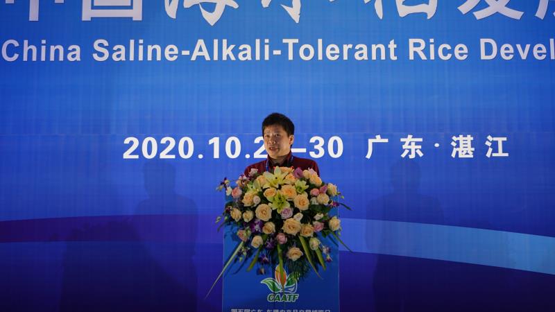 国家耐盐碱水稻技术创新中心耐盐碱水稻育种首席科学家李新奇围绕“杂交海水稻研究与应用”进行主题演讲,从种质挖掘及功能基因作用机理研究、优和组合选育良亲本创制、生理生态机理及调控技术研究、丰产模式构建与示范等方面进行介绍。