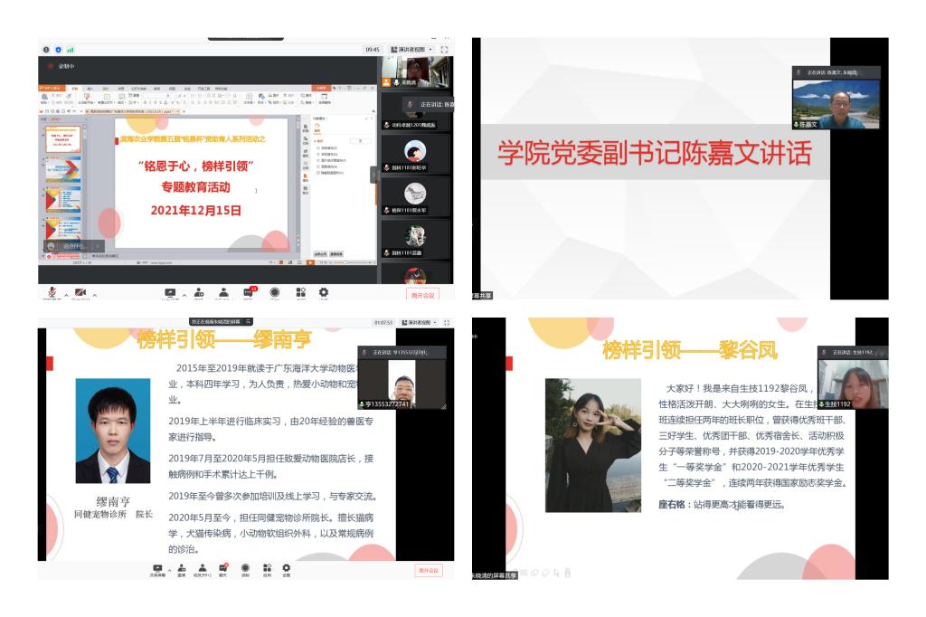 “铭恩于心、榜样引领”专题教育活动于12月15日晚通过腾讯会议举行,公司党委副书记陈嘉文、各系辅导员以及公司全体受资助同学参加。活动第一部分是由辅导员朱晓清讲解国家资助政策和SUNBET体育奖助学体系,介绍公司2021年度奖助学情况,强调了公司公司跟随国家角度,不让员工因为家庭困难而辍学,希望受资助同学能感党恩、跟党走、正青春、共奋进。活动第二部分邀请了公司自立自强典型人物生技1192黎谷凤同学和2019届毕业员工缪南亨介绍了自己奋进的心路历程,激励受资助同学积极进取、努力学习,实现自己的人生理想。随后陈嘉文从自身成长经历告诉同学们只有国家的强大才有个人更好地发展,他也希望受资助同学能从多元资助体系中成长成才,把自己的个人理想和国家前途命运结合在一起,学好专业知识为乡村振兴战略贡献自己的一份力量。最后公司向全体受资助同学发出做“资助政策的学习者、传播者和知恩感恩的践行者”的倡议书。