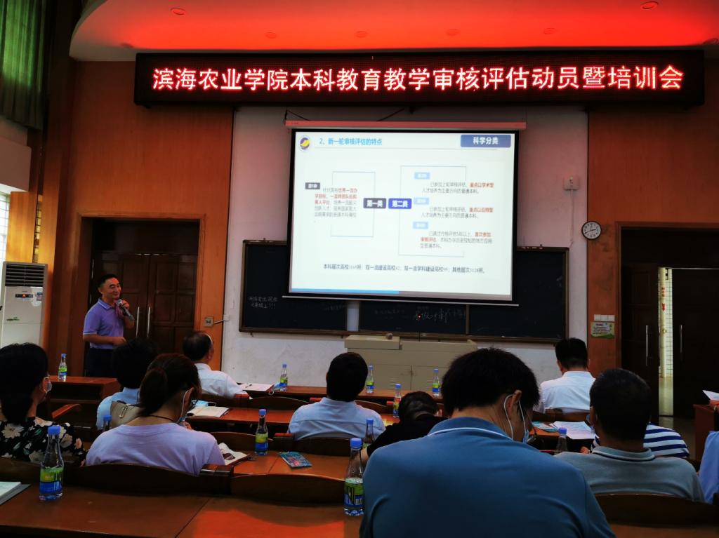 为落实开展好公司本科专业评估和教育部专业审核评估工作,8月31日下午,SUNBET申博体育在兴农楼109室召开本科公司产品审核评估动员暨培训会,会议由郑殿峰经理主持,邀请了公司质量监控与评估中心黄晋主任作培训报告,全院领导和教职工参加了会议。