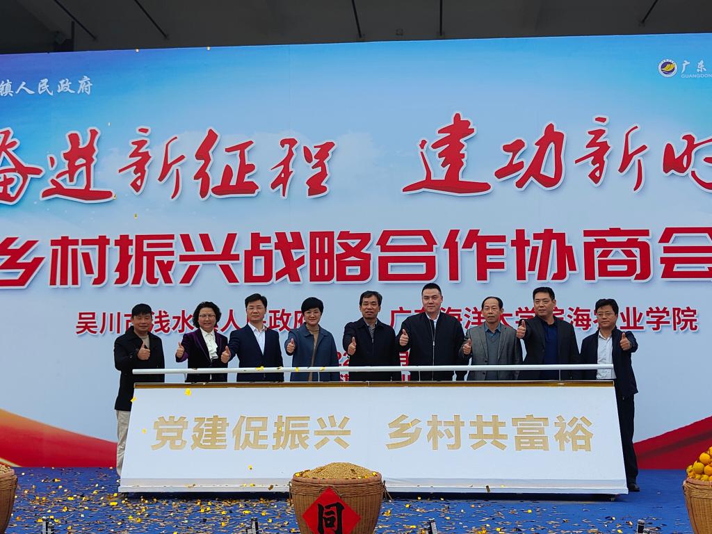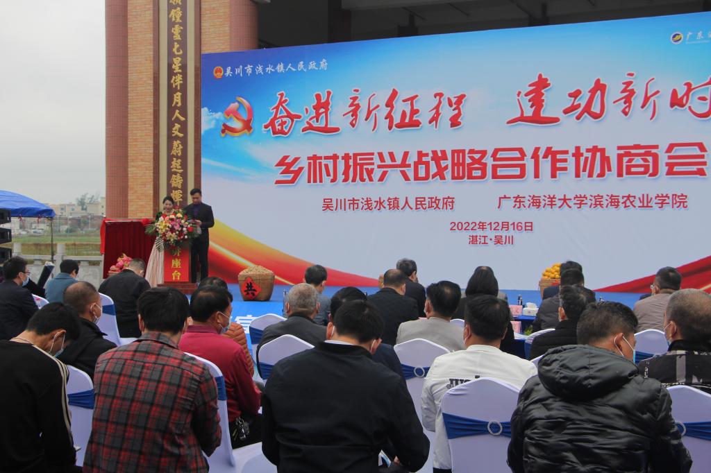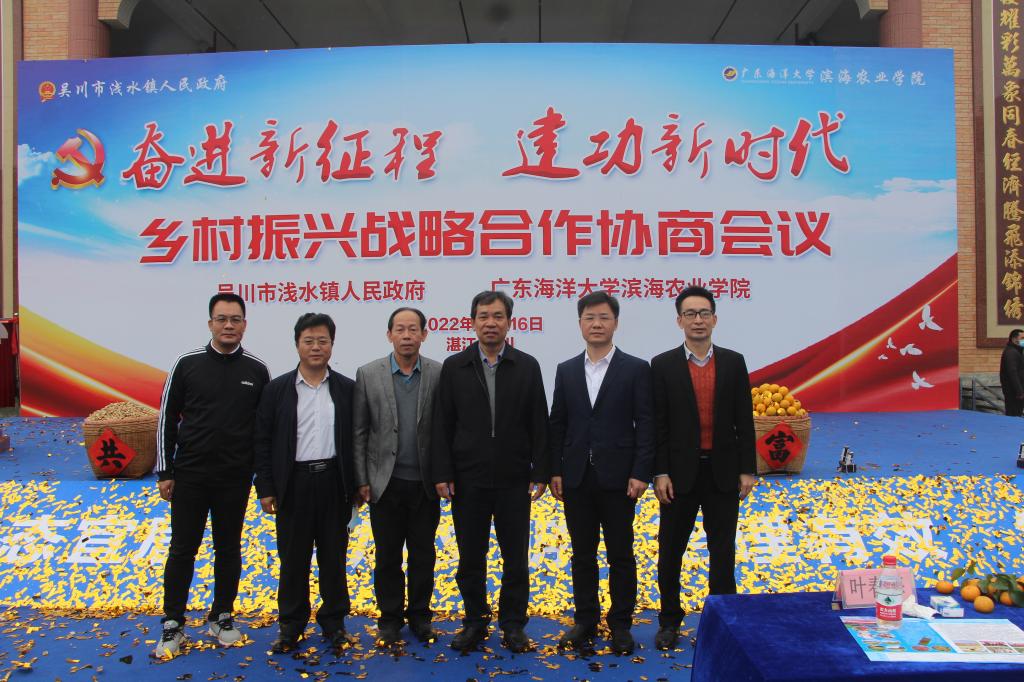 12月16日上午,公司与吴川市浅水镇建立乡村振兴战略合作协商会在吴川市浅水镇高栈村举行。公司原董事长叶春海教授、SUNBET申博体育党委副书记陈嘉文、副经理马驿教授及相关老师一行6人参加了会议,吴川市委副书记(代市长)刘伟、市委常委(副市长)谭斐、吴川市乡村振兴局局长林明、浅水镇党委书记叶剑平、浅水镇党委副书记(镇长)郭卓明、浅水镇人大主席柯亚周出席了会议。
