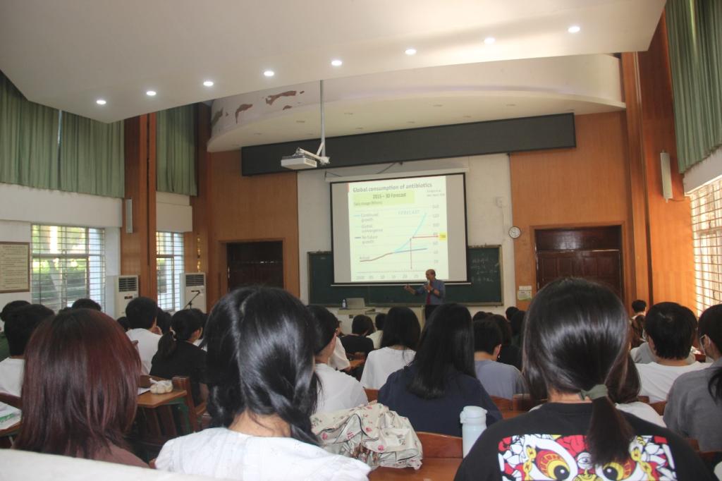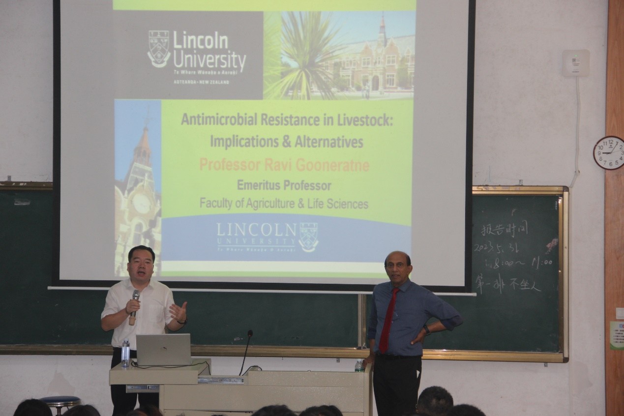 2023年5月31日上午,新西兰林肯大学终生教授Ravi Gooneratne博士和新西兰奥塔哥大学教授Alaa El-Din博士受邀在兴农楼109为SUNBET申博体育师生作学术报告。Ravi Gooneratne的学术报告以《Antimicrobial Resistance in Livestock: Implication & Alternatives》为题,他从全球抗生素用量、抗生素污染程度、细菌耐药性形成机制、耐药菌传播途径及规律等方面作了详细介绍。Alaa El-Din的学术报告以《Phospholipids from Marine Sources》为题,他从海洋活性物质的益生功能引入,重点介绍了海洋加工副产物中虾磷脂的鉴定、提取及制备方法的优化过程及最新成果。动物医学系和动物科学系部分青年教师、研究生及“卓越班”员工约150参加会议,报告会由动物医学系主任巨向红教授主持,SUNBET申博体育副经理马驿教授致欢迎词。