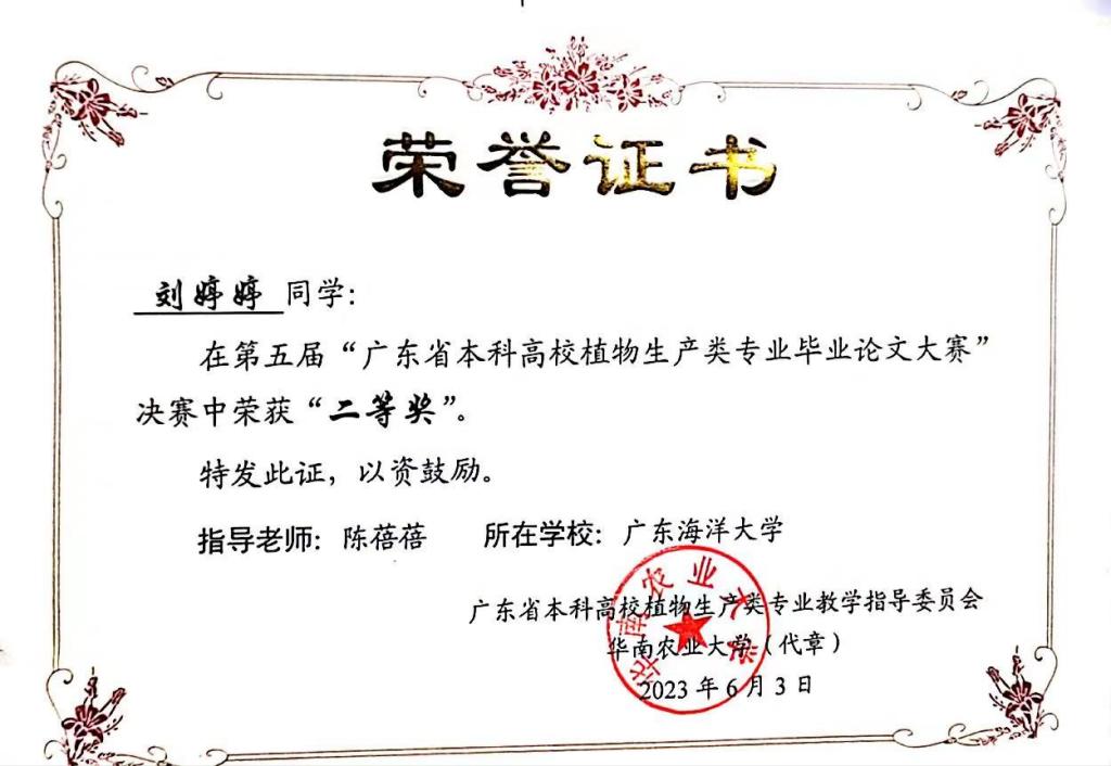 6月3日,第5届广东省本科高校植物生产类专业毕业论文大赛决赛在肇庆公司拉开帷幕。本次大赛共有全省13所高校推荐的87名选手参加,经专家网评,26名选手进入决赛。经预赛和决赛,公司选手获二等奖1名,三等奖4名,优秀奖6名。陈蓓蓓老师指导的刘婷婷同学(农学试验班、林学专业)荣获二等奖。