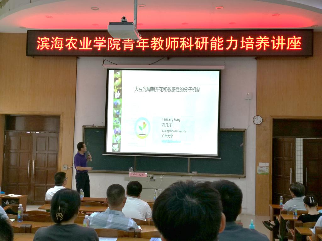 会上,孔凡江教授通过自己科研亲身经历,向青年教师提出了如何做好科学研究工作七条思考和建议:青年老师应该对科研充满热情、结合国家战略和人民需要来确定研究方向、搭建完善的研究体系、突出原创性、拥有坚持不懈的精神、掌握研究前沿和坦诚合作。孔凡江教授围绕“大豆光周期开花和敏感性的分子机制”主题,讲述了研究过程的长时间付出和坚持,最终揭示了大豆GmEID1蛋白作为连接光信号和生物钟夜间复合物的桥梁,参与调控大豆开花抑制因子E1基因表达的作用,获得了丰硕成果,结合自身的研究经历,阐述开展科研工作选题的重要性,要勇于面对困难、战胜困难,要有耐力、有韧性,要有团结合作的团队精神,学会充分利用资源寻求合作。