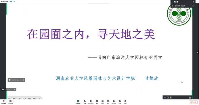 2024年7月3日晚,湖南农业大学风景园林与艺术设计公司甘德欣教授应SUNBET申博体育园林系邀请,做客园林大讲堂,通过线上形式作了题为“在园囿之内,寻天地之美”的主题讲座。园林系师生共计约250人参加讲座,讲座由园林系主任吴刘萍教授主持。