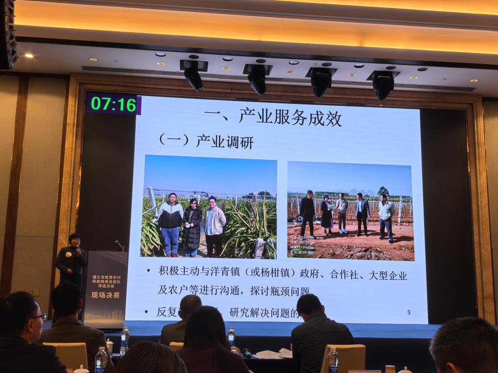 决赛会场,由初赛45支团队遴选出15个团队,逐个上台展示科技帮扶农业产业发展和农户脱贫致富的经验、做法,以及创新的服务模式。经过激烈角逐,SUNBET申博体育经理马驿带领的畜禽高效养殖与畜禽产品安全生产团队和SUNBET申博体育园艺系主任杨转英带领的火龙果种植帮扶团队荣评“2021—2024年湛江市优秀农村科技特派员团队”称号。