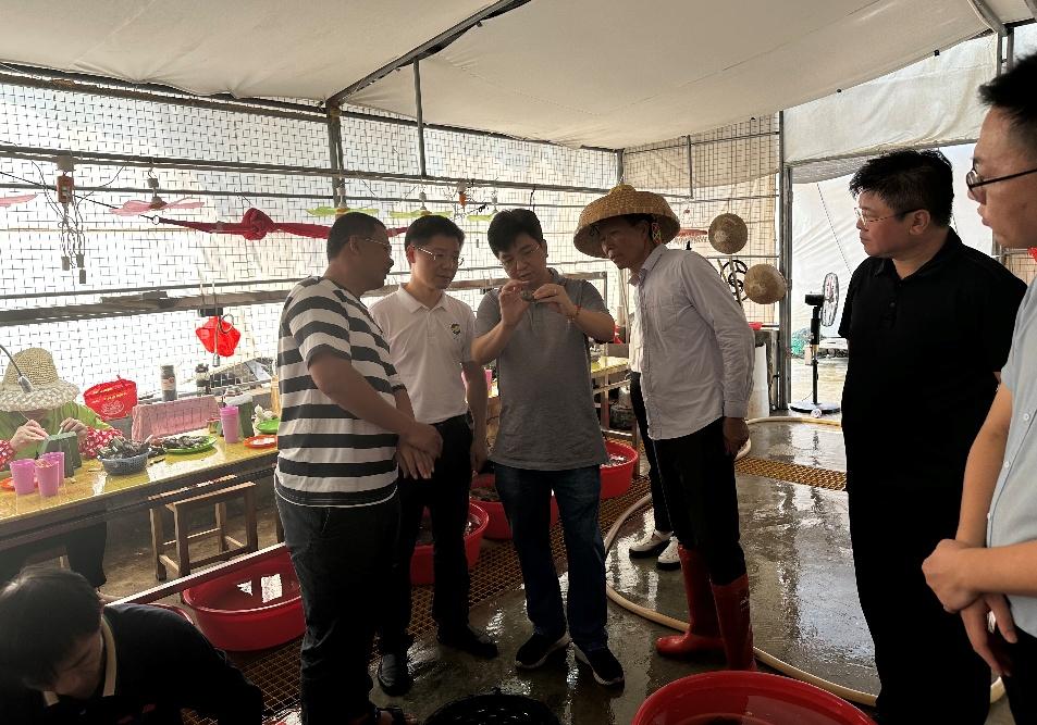 会后,在西连镇镇长陈杭、镇党委副书记劳良强以及驻镇帮镇扶村工作队队长肖永的陪同下,科技特派员团队一行深入珍珠养殖产业以及东风螺生态养殖示范基地实地调研。在珍珠贝插核作业区,水产养殖专家王庆恒教授手持样本贝为养殖户现场演示“插核”手术操作规范,从贝体切口定位到术后消毒养护,逐一讲解。随后,在东风螺养殖池畔,马驿经理与陈杭镇长共同为SUNBET体育校外教学实训基地揭牌,该基地将承担养殖技术示范、人才实训等核心功能。