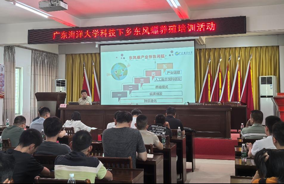 聚焦养殖技术需求,集结公司水产养殖领域专家,联合西连镇政府举办东风螺养殖专题培训会,养殖户代表、农技人员及政府相关部门负责人等30余人参会。会上,公司水产养殖专家吕文刚对东风螺养殖中的疫病防控、水质调控等关键技术及重点环节进行了详细讲解,并结合典型病害进行实景剖析,有效提升养殖户病害预警与防控能力。特派员团队现场向参训养殖户发放消毒剂、多维电解质等渔用物资大礼包。