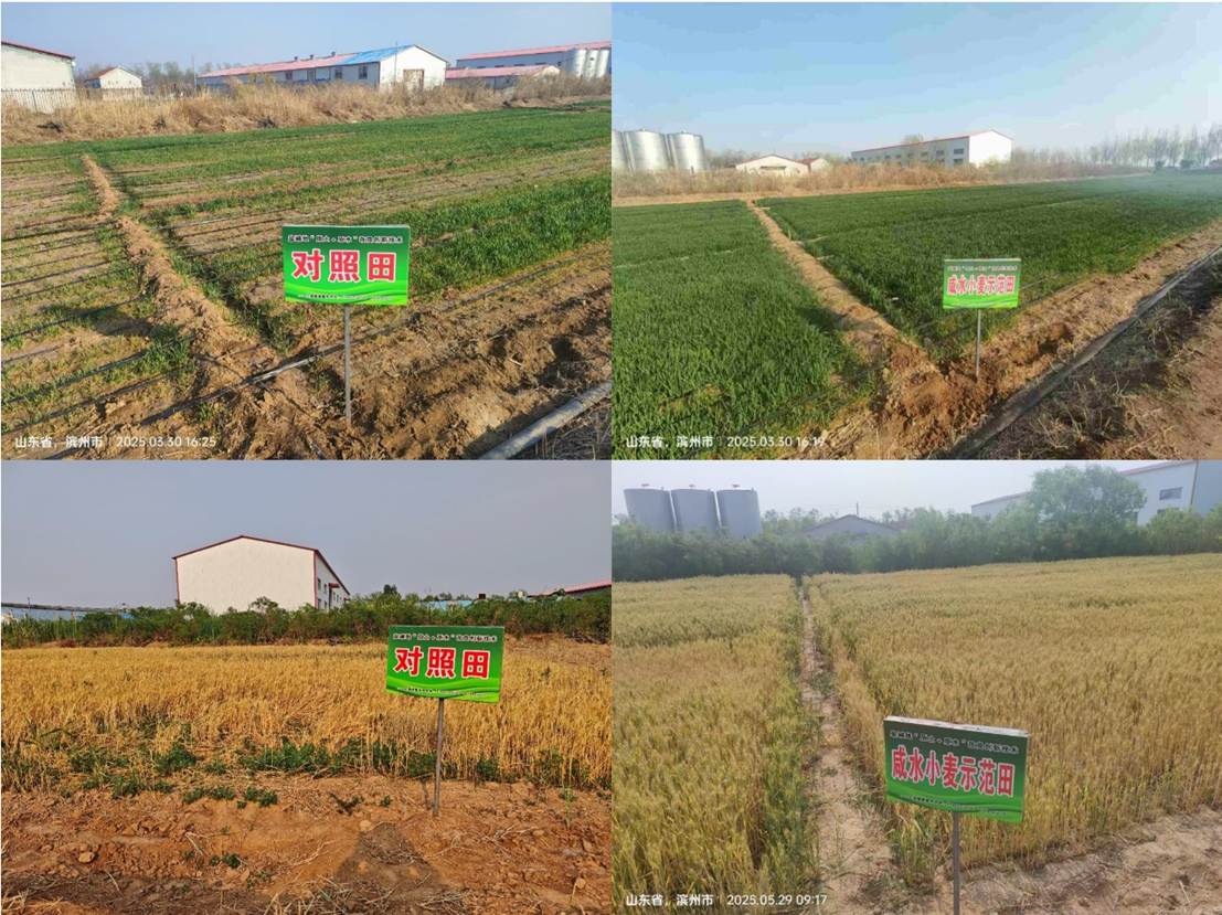 项目组于2024年10月12日播种小麦,施用蚯蚓有机肥500公斤/亩,处理田浇灌咸水时配施土壤微生物复合改良剂,对照田不施改良剂,田间管理按当地常规生产。示范基地土壤含盐量为0.56%~0.82%,浇灌水盐度为0.65%~0.89%。对照田冬前和返青后死苗严重。