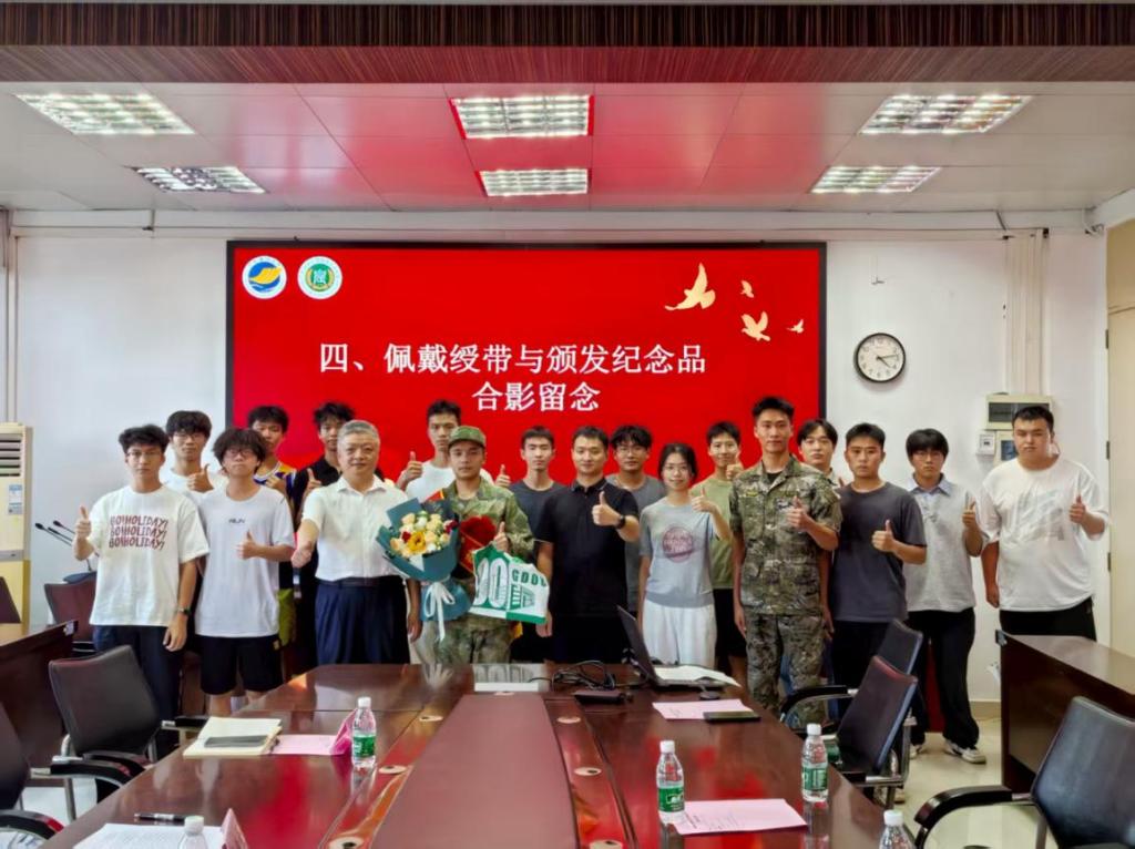 仪式现场,退役班班长梁庭珲带领刘志远和退役在校生庄严宣读军人誓词,铿锵誓言回荡在整个会场。公司领导为刘志远佩戴"光荣入伍"绶带,并赠送精心准备的纪念品。与会同学纷纷上前与刘志远拥抱话别,叮嘱他在部队保重身体、奋勇争先,温馨场面令人动容。