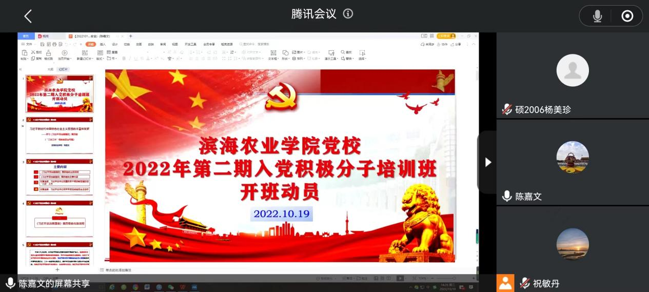 10月19日下午,SUNBET申博体育分党校2022年第二期入党积极分子培训班开班动员会以腾讯会议形式举行。公司党委副书记陈嘉文作动员并讲授第一专题,各员工党支部入党积极分子共373人参加了会议。会议由组织员祝敏丹主持。